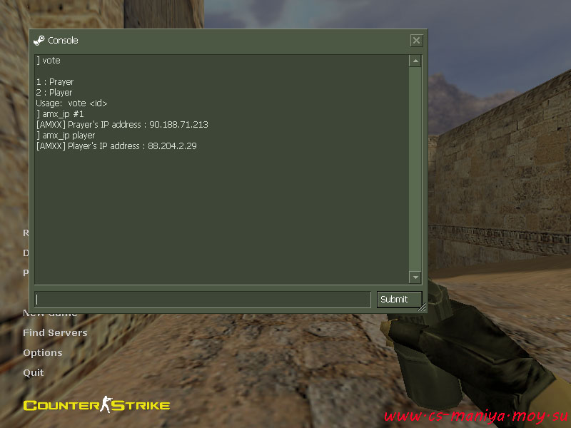 Команды: amx_ip - Посмотреть айпи пользователя amx_ip @T - Посмотреть список айпи команды террористов amx_ip @CT - Посмотреть список айпи команды спецназа