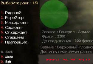 Версия 1.2 : + админ меню (3 команды видим на скрине) + в бонусы добавлено увеличение HP в зависимости от звания + добавлена блокировка lvl-up меню на некоторых картах, new const restrict_bonus[][] + исправлены баги версии 1.1, их было очень много