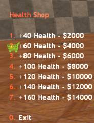 Cvars: hs_40hp_cost 2000 (default) //2000 = сколько он стоит hs_60hp_cost 4000 (default) //4000 = сколько он стоит hs_80hp_cost 6000 (default) //6000 = сколько он стоит hs_100hp_cost 8000 (default) //8000 = сколько он стоит hs_120hp_cost 10000 (default) //10000 = сколько он стоит hs_140hp_cost 12000 (default) //12000 = сколько он стоит hs_160hp_cost 14000 (default) //14000 = сколько он стоит