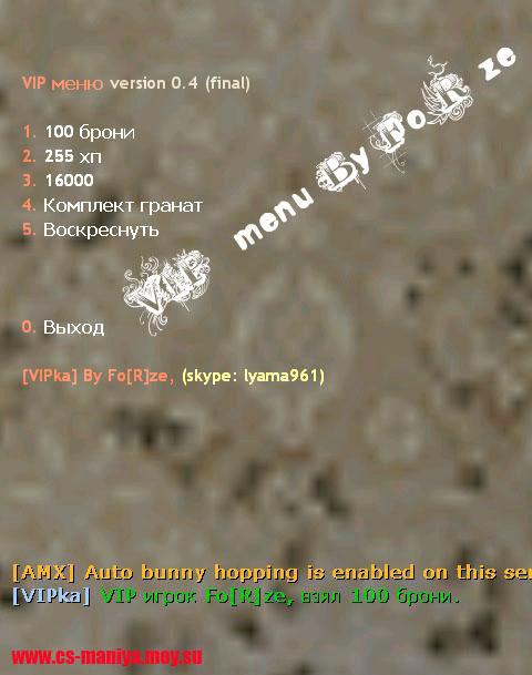Установка: 1) Закинуть папку "vipka" в cstike/sound 2) Закинуть файл vip_menushka в папку "plugins" 3) прописать название плагина в plugins.ini P.S кому надо исходник пишите в скайп: lyama961, сами понимаете нехочю чтобы всякие "умельцы" написали VIP menu by trololo... P.S.S Исходник отдам за спасибо:)