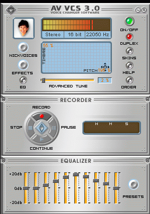 | Уникальный инструмент для изменения голоса - мечта шутников, телефонных террористов и любителей караоке Пользователь говорит в микрофон, а программа в реальном масштабе времени заставляет его голос звучать ниже (как у солидного мужика:) или выше (как у женщины или подростка:). Высота голоса задается с помощью ползунка "Pitch Level", а выходной сигнал можно дополнительно "доработать" с помощью 9-полосного эквалайзера.Голос, прошедший через AV VCS, мама родная не узнает, разработчики гарантируют. В этом легко убедиться, записав-прослушав свой "новый" голосок с помощью стандартного Виндозного Рекордера. Вдобавок, AV VCS совместим со всеми программами для интернет-телефонии (NetMeeting, net2phone и т.п.). Так что эту прогу можно применять не только для розыгрышей, но и для сохранения анонимности при общении в Сети голосом